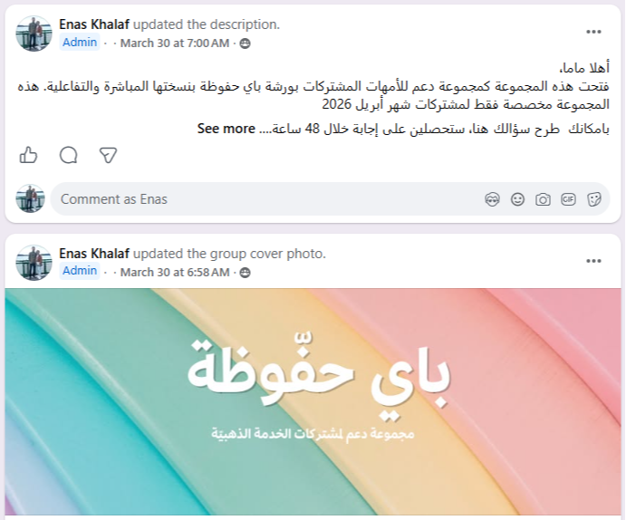 "مجموعة الدعم هي الاستثمار الذي يضمن لكِ الحصول على دعم خلال مرحلة التدريب، وبأقل قدر من التعب النفسي لكِ ولطفلك."